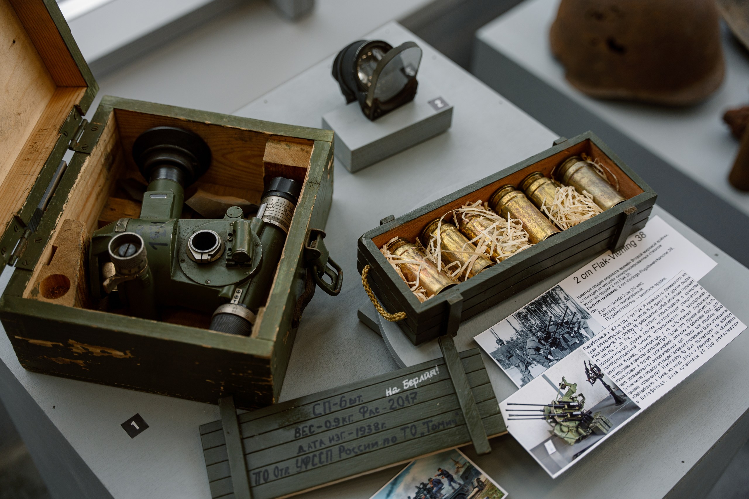 Среди них Знамя 197 стрелковой дивизии, полевой хирургический набор времен 1941-1945 гг (ножницы и зажимы, бокс для стерилизации инструментов, сумка-аптечка), образцы военной формы (пилота, танкиста, пехоты), армейский бинокль, портсигар, военные карты, агитационные материалы и многое другое.