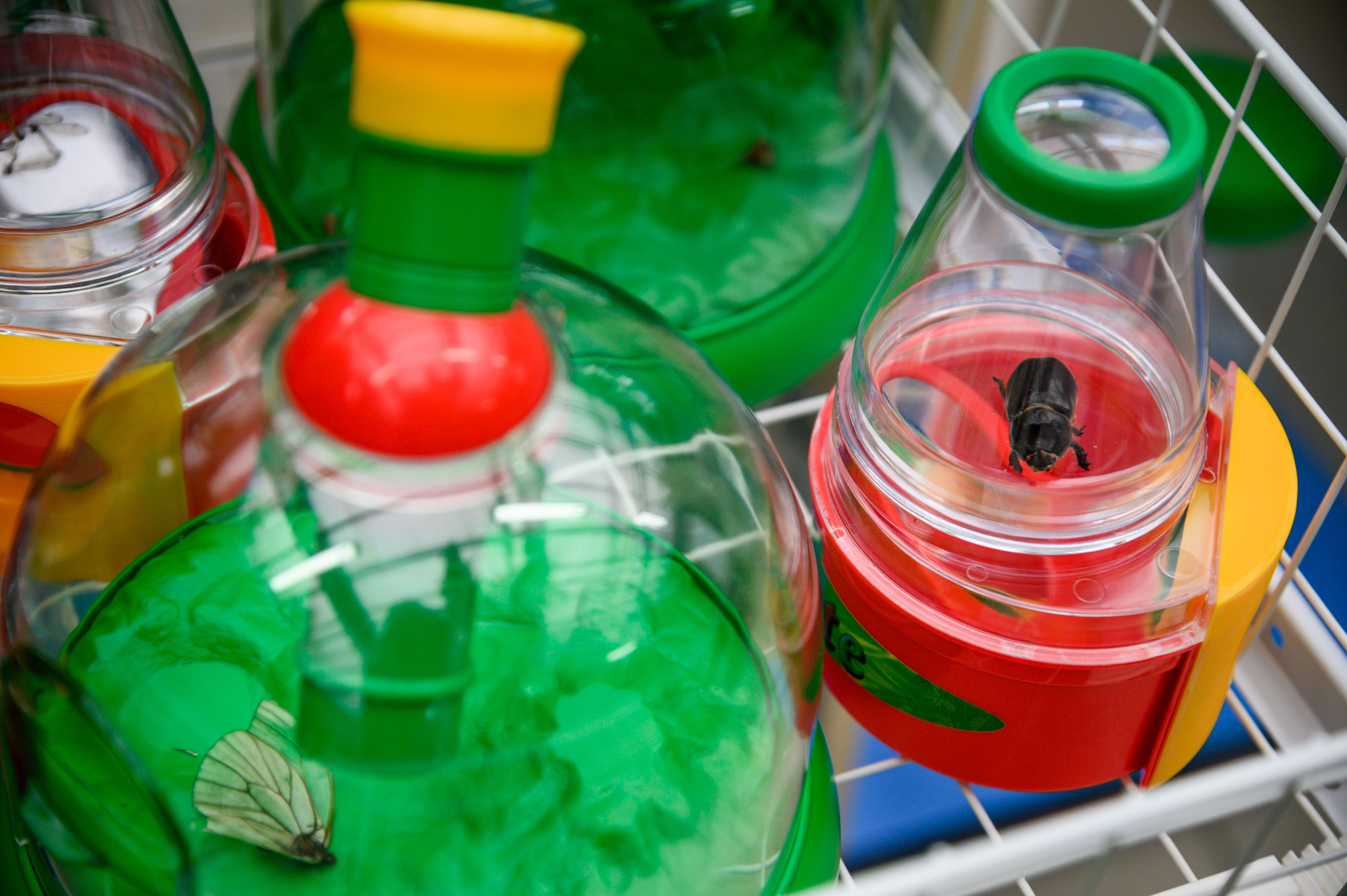 Летом прозрачные домики можно выносить на прогулку: помещать туда живых насекомых, рассматривать через прозрачные стенки и лупу, выпускать на волю. Еще есть «домик» для муравьев, имитирующий настоящий муравейник, и уникальный «домик» с усилителем звука и наушником, который позволяет хорошо расслышать шорохи насекомых.